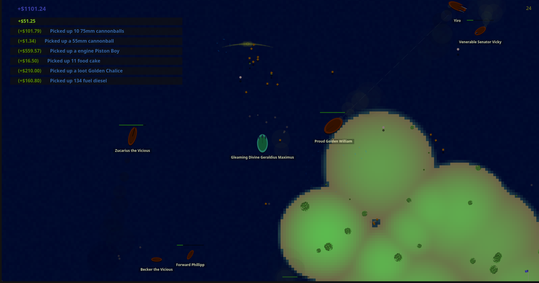 Invade islands, loot items, destroy or avoid ships, leave islands, upgrade your ship! Collect cartographic insight to find new islands to invade! Buy new ships, hire more crew, feed and wage your crew to ward off strikes. Swap your ship for a bigger one, or buy new ships, and appoint subcaptains to your fleet ships! Die to crossfire or an enemy's black-hole-charge cannonball, and start all over from the trusty Dependable Dave.